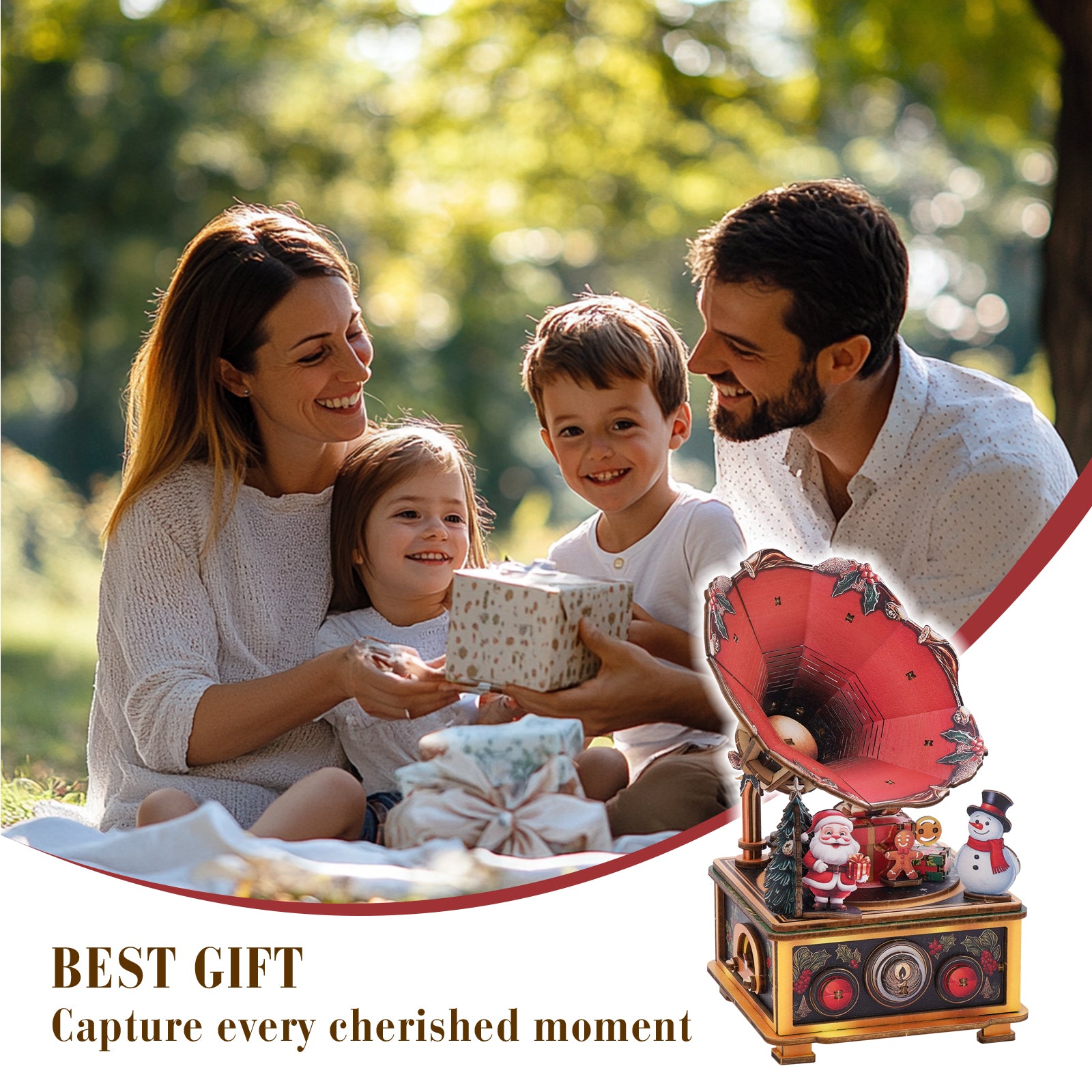 Celebrate Christmas with this DIY music box featuring a classic gramophone, Santa Claus, and a snowman. Made from eco-friendly wood and includes 99 laser-cut pieces.