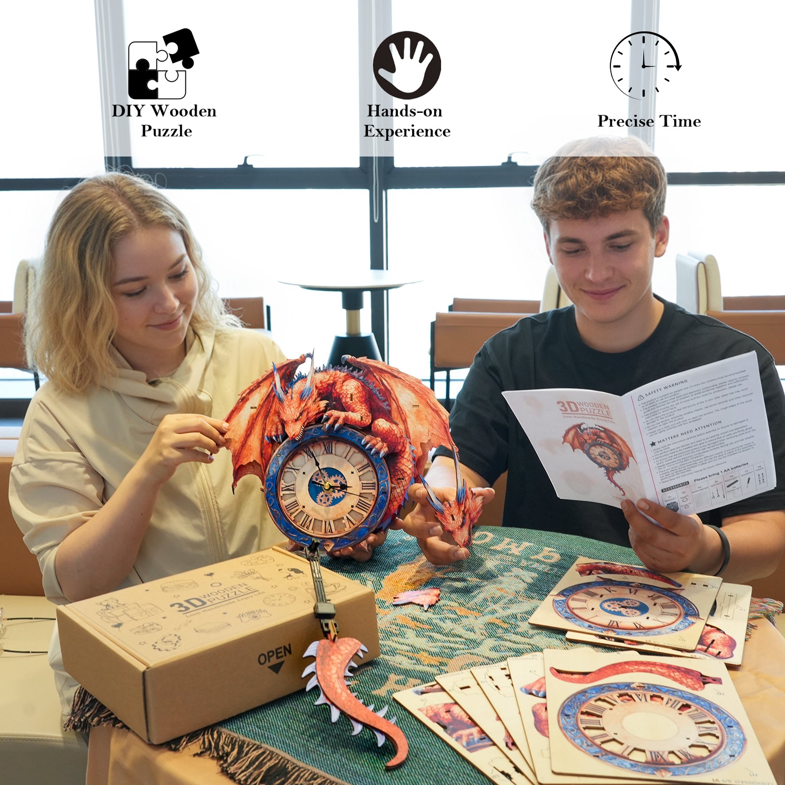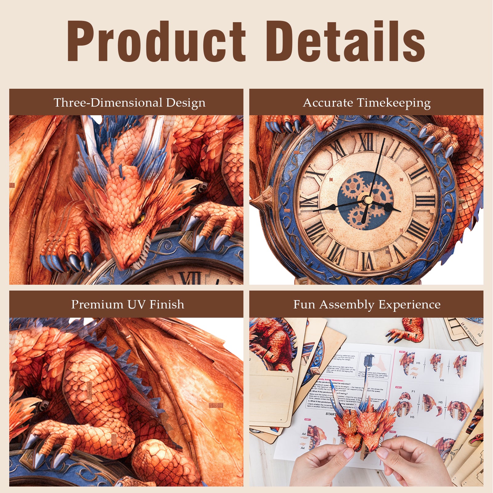 Made from eco-friendly laser-cut wood, 38 precision pieces feature UV-printed colors for the dragon and clock, ensuring a vivid and sturdy wood clock kit.