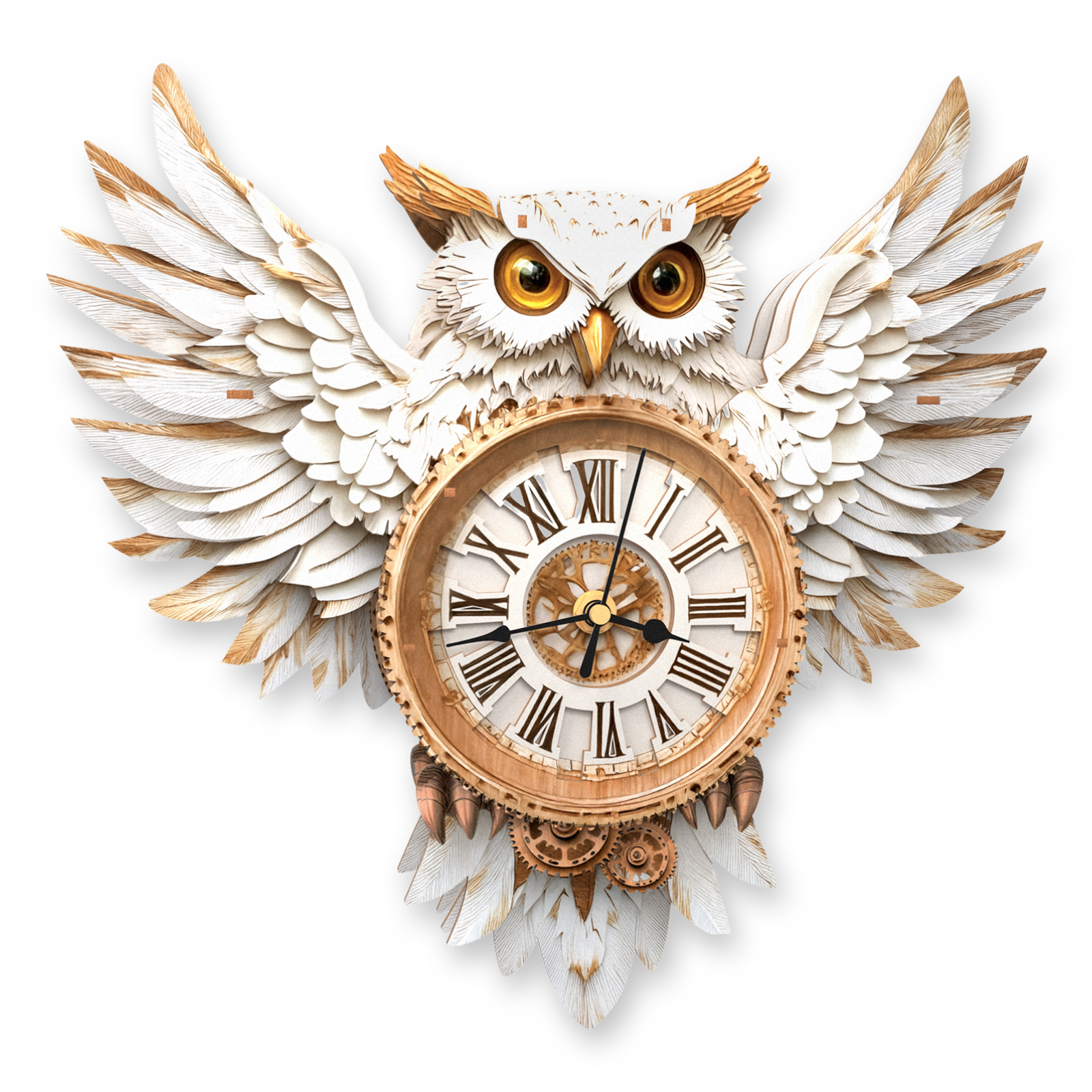 Assemble a magical 3D wood puzzle featuring a majestic snowy owl perched on a functioning wood clock. This kit merges artistic charm with mechanical function.